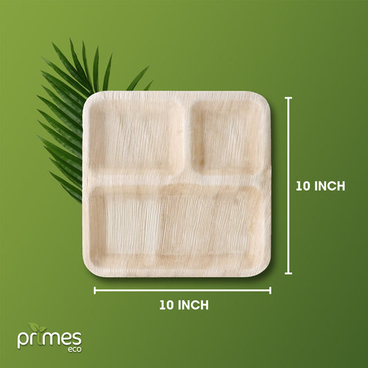 PRIMES ECO 10 x 10 Inch Areca Leaf Square Plates, Heavy Duty Biodegradable Plates 3 Compartment Plates, Eco Friendly & Biodegradable Heavy-Duty Plates, Microwave & Oven Safe, Party & Picnic