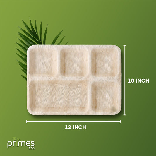 PRIMES ECO 12 x 10 Inch Areca Leaf Rectangular Plates, Heavy Duty Biodegradable Plates 5 Compartment Plates, Eco Friendly & Biodegradable Heavy-Duty Plates, Microwave & Oven Safe, Party