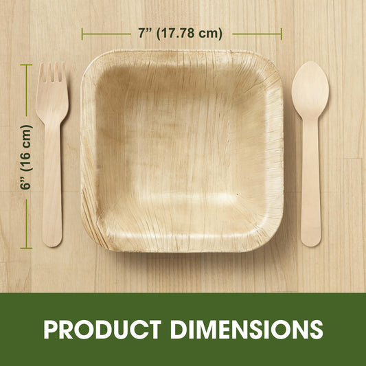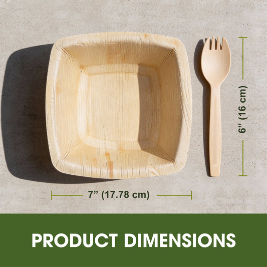 Disposable Palm Leaf 7 Inch 600ml Square Bowls with Birch Wood Spoon & Fork Combo Set | Strong Disposable Palm Leaf Bowls for Parties, Catering, Events & Everyday Serving