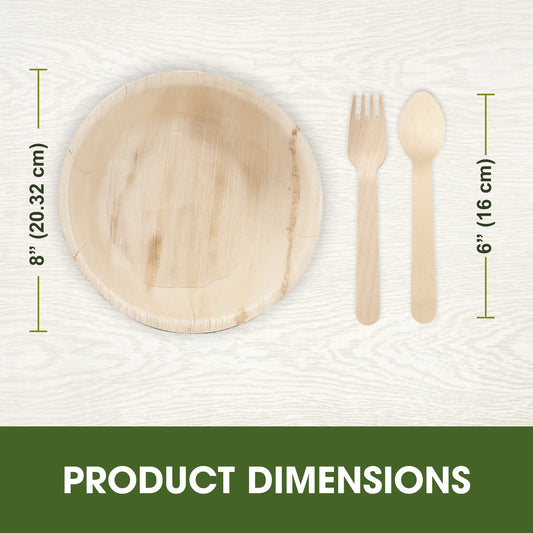 Disposable Palm Leaf 8 Inch 900ml Round Bowls with Wooden Spoon & Fork Combo Set for Parties, Catering, Events, Strong Disposable Palm Leaf Bowls for Hot & Cold Foods