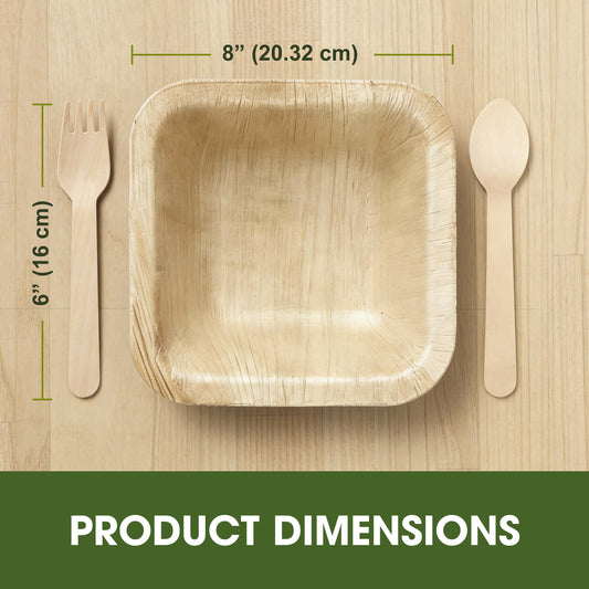 Disposable Palm Leaf 8 Inch 900ml Square Bowls with Wooden Spoon & Fork Set, Strong Disposable Palm Leaf Bowls for Parties, Catering, Events & Everyday Use