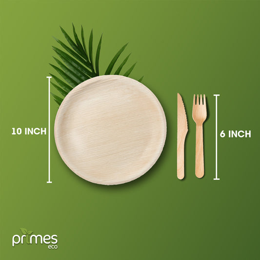 PRIMES ECO 10 Inch - 25pcs Disposable Palm Leaf Plates and Wooden Cutlery Set, 25x Large Round Plates, 25x Forks, 25x Knives, Eco Friendly Biodegradable, Office Home Party Plates 1 Box(25PCS)