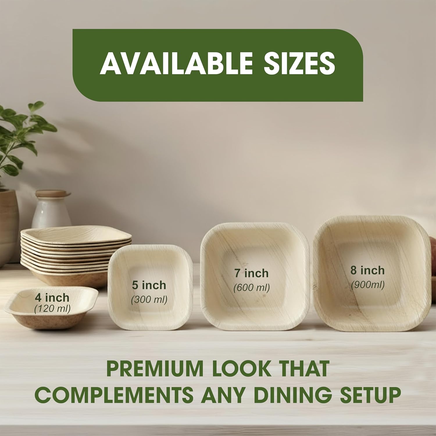 25pcs Square Disposable Palm Leaf Bowls of 5” (13cm) 19.4oz (300ml), Biodegradable & Compostable, Natural Areca Tableware for Hot & Cold Food, Soup, Salad, Dessert, BBQ, Picnic & Parties