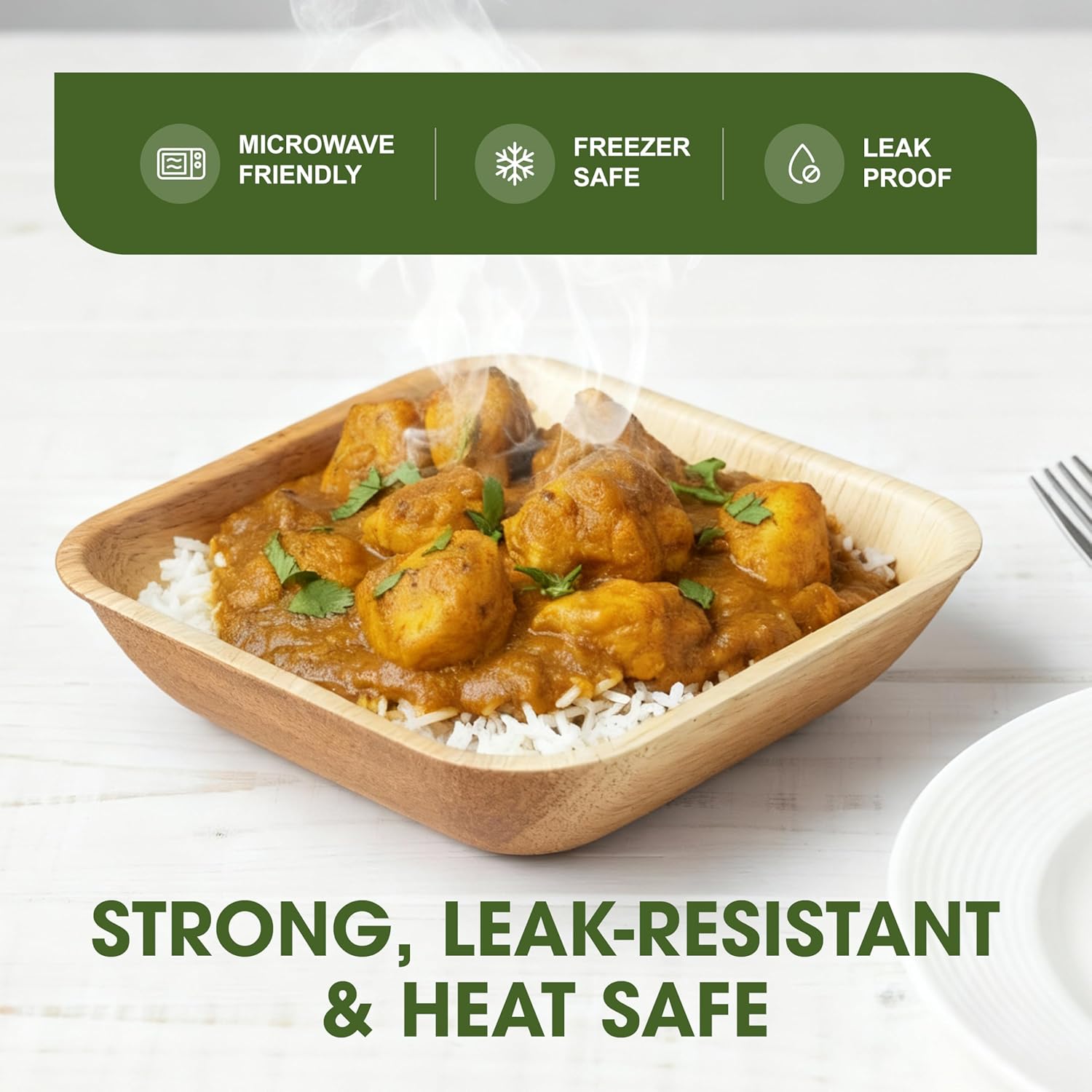 - STURDY AND RELIABLE FOR EVERY MEAL: Built to hold firm under any weight, these palm leaf bowls won’t bend or leak. Confidently serve soups, curries, or pasta in these durable serving bowls that act as both a microwave bowl and a camping bowl. Perfect for small disposable bowls or large serving bowls needs, they handle hot, cold, dry, or saucy foods with ease — keeping your table clean and stylish.