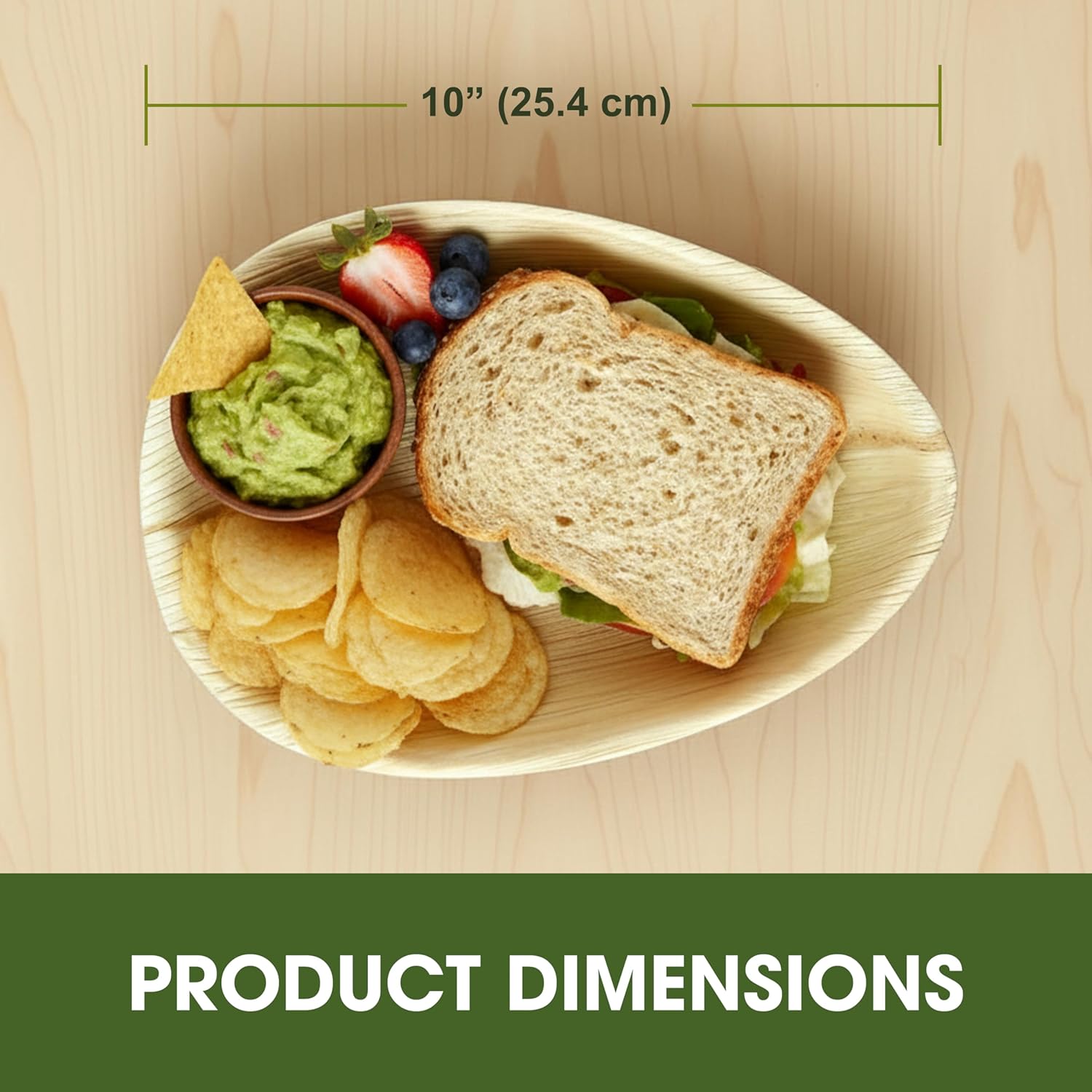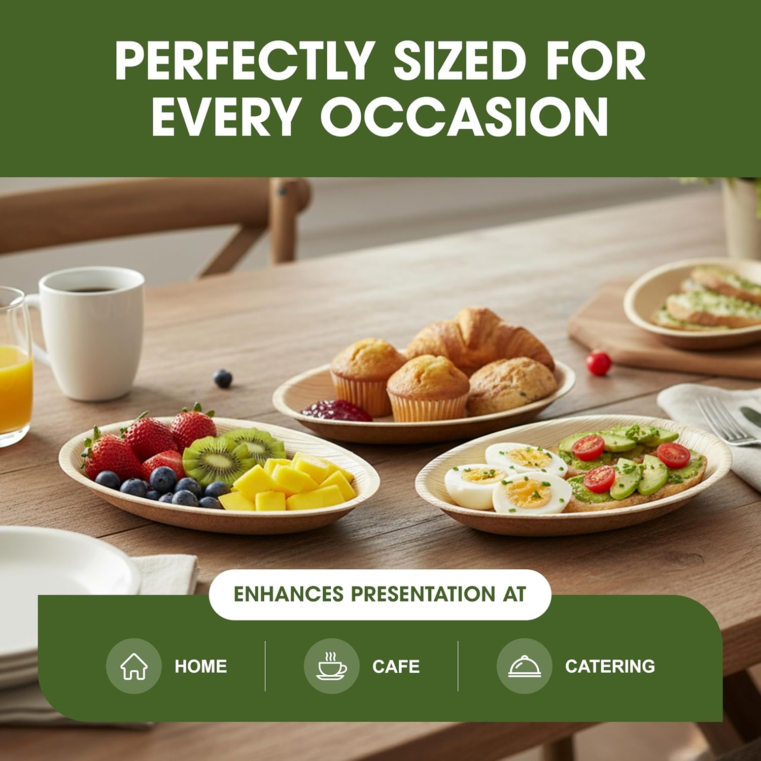 - STRONG & DURABLE FOR HOT OR COLD SERVINGS: Crafted from premium areca palm leaves, these oval dinner plates feature a sturdy base that resists bending or leakage. Ideal for both hot curries and chilled desserts, they’re dependable disposable plates for hot food used indoors or outdoors.